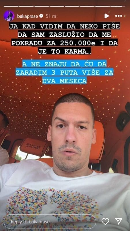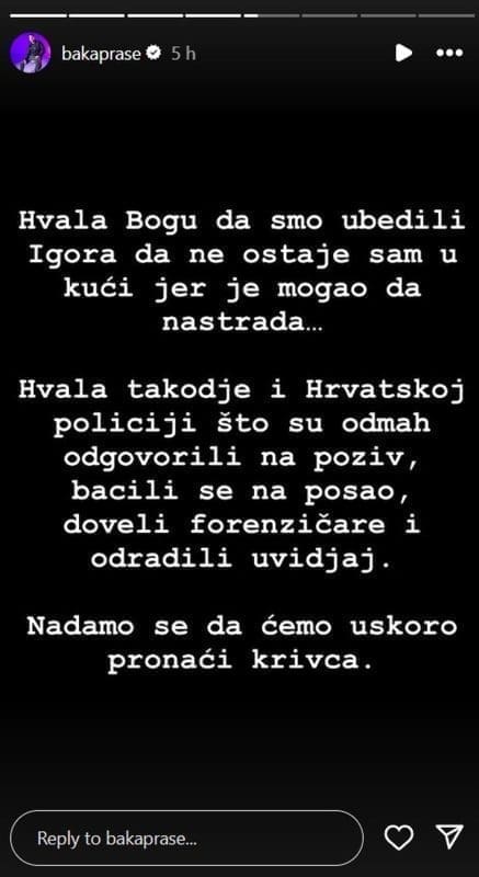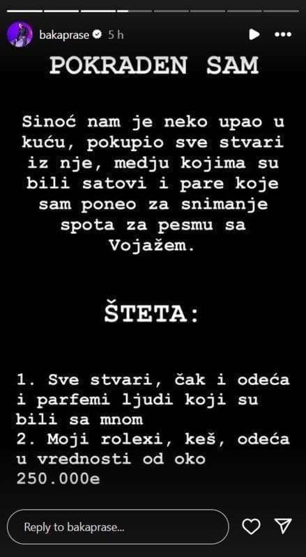 Baka Prase je na svom Instagram profilu otkrio detalje pljačke: "Pokraden sam. Sinoć nam je netko upao u kuću i pokupio sve stvari, među kojima su bili satovi, novac za snimanje spota, odjeća i parfemi. Šteta je procijenjena na 250.000 eura. Hvala Bogu da smo uspjeli uvjeriti Igora da ne ostaje sam u kući jer je mogao nastradati."