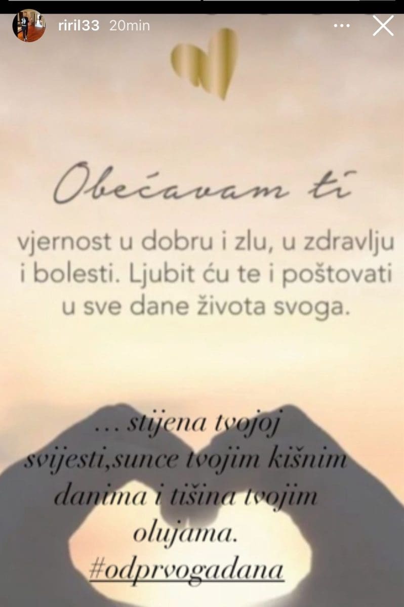 Njegova Iris pokazala je još jednom da mu je vjećna porška i što znači ona "U dobru i zlu". Naime, objavila je na svom Instastoriju citat vjenčanih zavjeta.