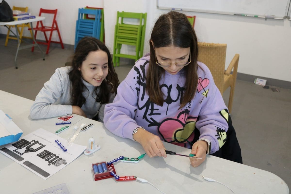 Na radionici Šareni strujni krug predavačica Dinka Lale objasnila je polaznicama strujni krug, nakon čega su spajali osnovne strujne krugove sa specijaliziranim setovima, proučavali kako rade led diode i ventilatori ovisno o vrsti spoja, te su isprobali kako radi senzor ravnoteže. Istraživale su i vodiče struje te isprobale mutimetar i voltmetar.
