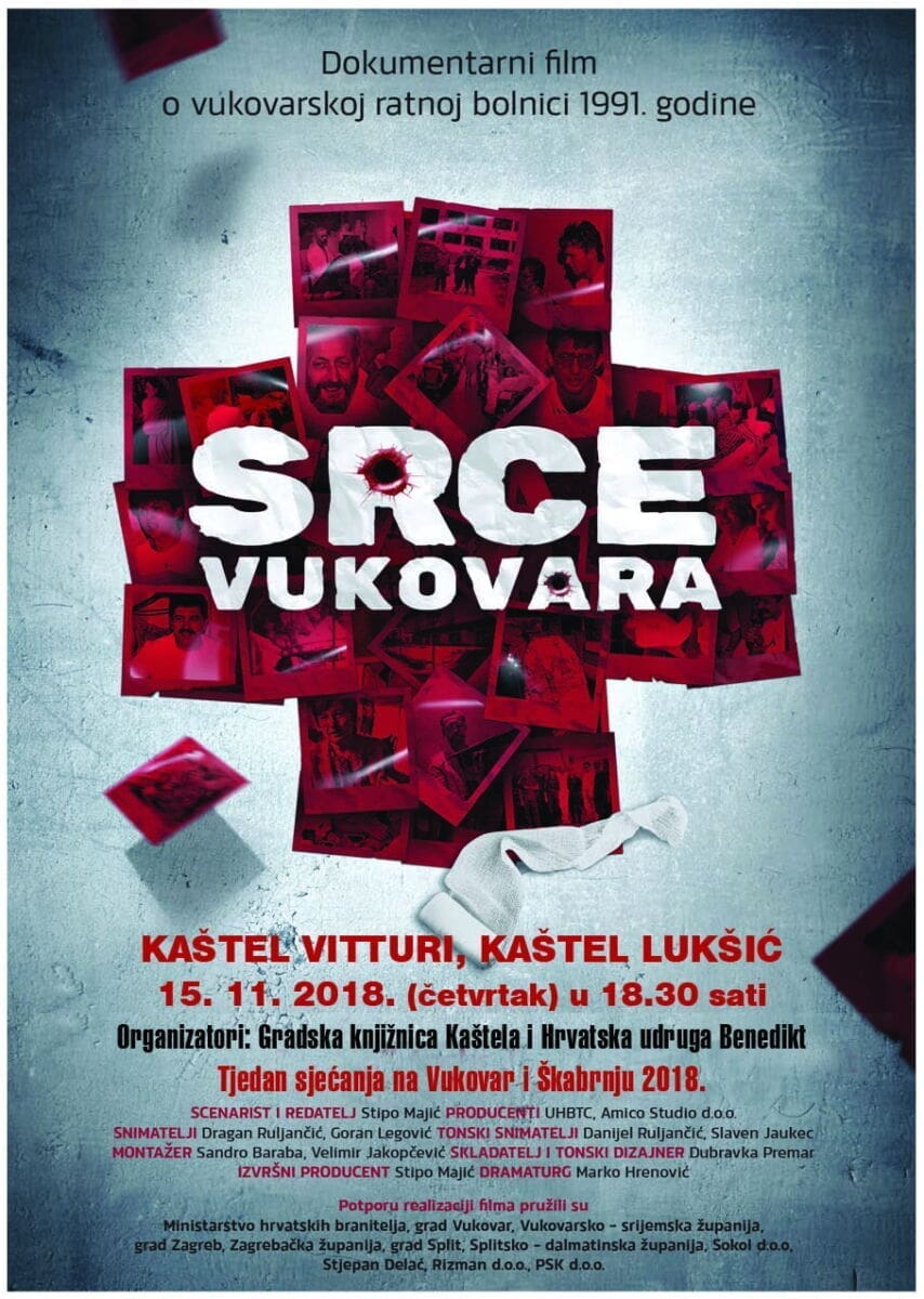 U sklopu ovogodišnjeg Tjedna sjećanja na Vukovar i Škabrnju Gradska knjižnica Kaštela i Hrvatska udruga Benedikt organiziraju prikazivanje dokumentarnog filma o vukovarskoj ratnoj bolnici 1991. godine pod nazivom “Srce Vukovara”.