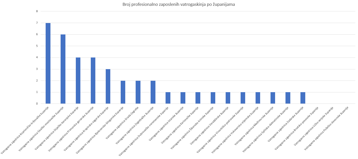 Profesionalnih vatrogaskinja imamo ukupno 33, a najviše ih je u zaposleno u Koprivničko-križevačkoj županiji (7), a slijede je Sisačko-moslavačka (6) i Osječko-baranjska (4) dok je od priobalnih županija najviše vatrogaskinja profesionalno zaposleno u Primorsko-goranskoj županiji (4). Profesionalnih vatrogaskinja je ukupno 33.