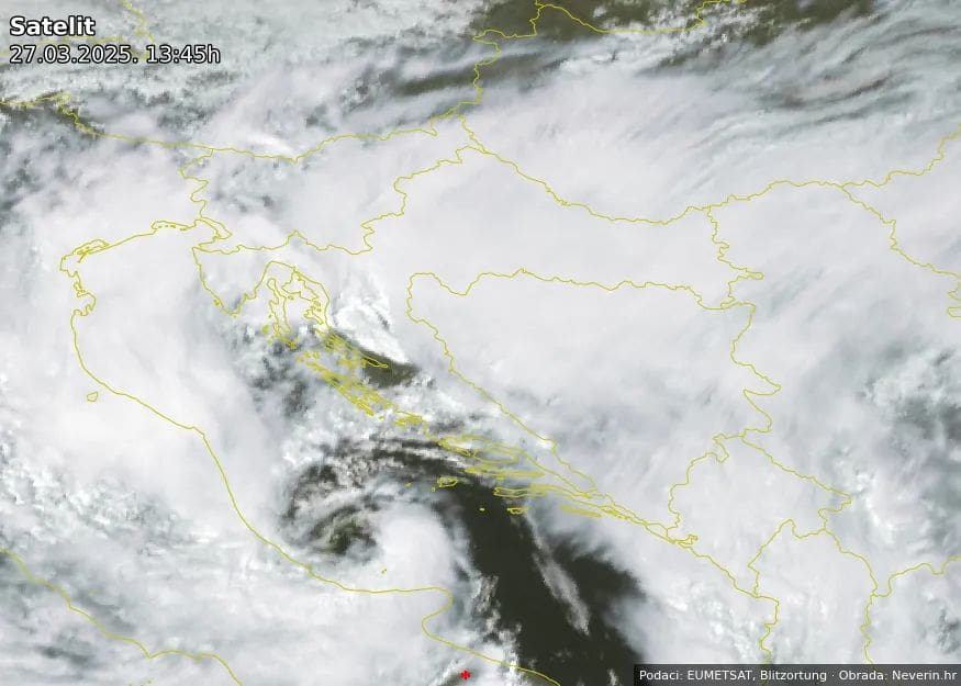 Jučer je na vrijeme intenzivno djelovala ciklona čiji se centar zadržavao nad talijanskom stranom Jadranskog mora. Na satelitu se moglo uočiti pravilno kruženje oblaka oko centra ciklona, a čak se vidjela i vedrina u "oku" ciklone zbog čega su pojedini meteorolozi naglasili mogućnost da je nastao "adricane" odnosno hibridna barička tvorevina između uobičajene ciklone i izvantropskog sustava.