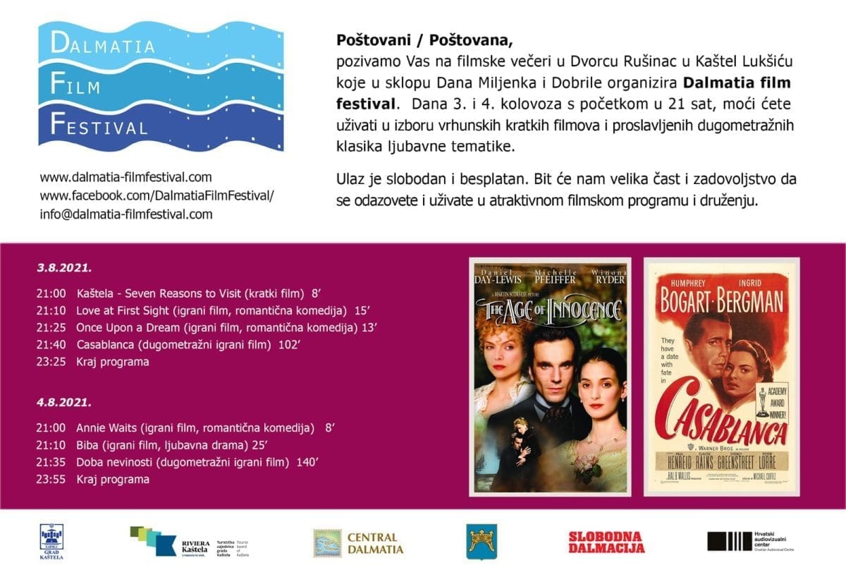 Filmske večeri održavaju se 3. i 4. kolovoza u dvorištu dvorca Rušinac. Obzirom da je broj mjesta ograničen i poštivat će se propisane mjere o distanci, zainteresirani posjetitelji ne trebaju imati Covid propusnice. Filmske večeri se održavaju u sklopu Dalmacija film festivala te će se prikazivati kratkometražni filmovi mladih autora i filmski klasici: Casablanca i Doba nevinosti.
