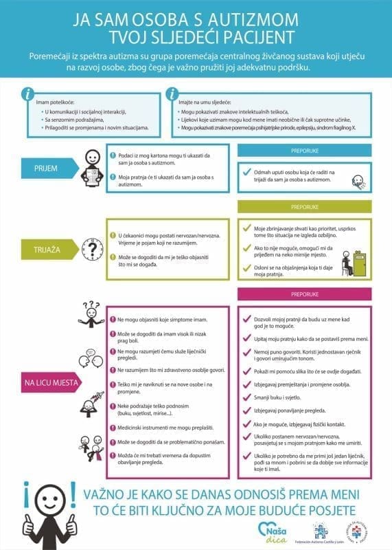Plakati bi trebali olakšati medicinskom osoblju, drugim pacijentima, ali i samim osobama s autizmom i njihovoj pratnji ophođenje s osobama iz spektra autizma u svim situacijama koje se mogu dogoditi od trenutka prijema do trenutka odlaska iz bolnice.