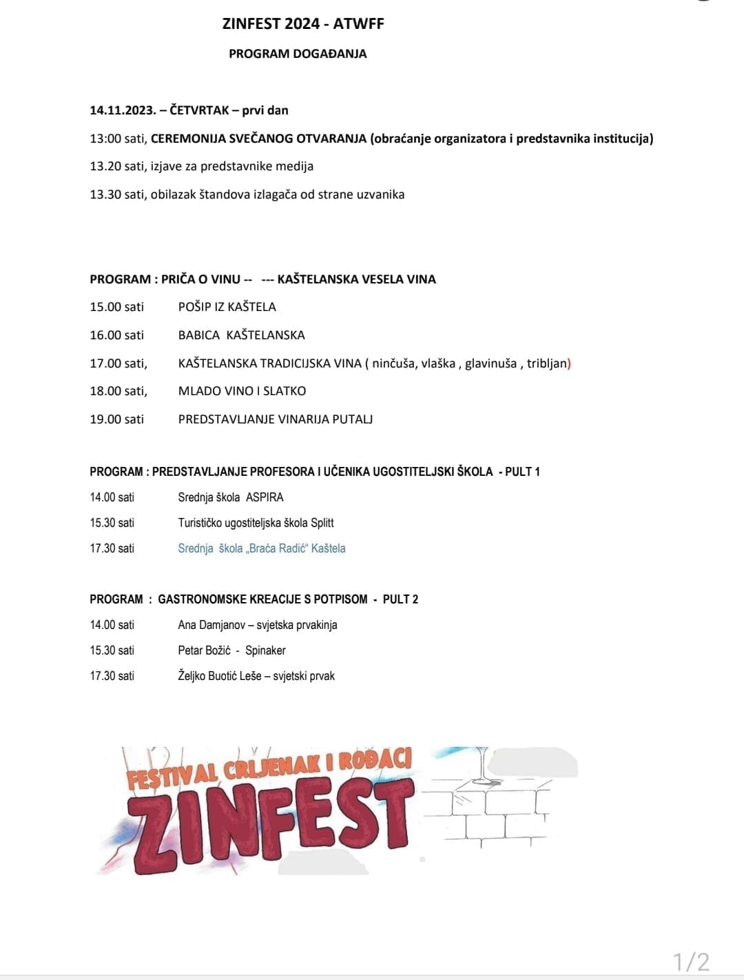 Otvaranje Zinfesta je 14. studenog u 13 sati u Marini Kaštela. Nakon ceremonije otvaranja očekuje nas obilazak štandova gdje će kaštelanski vinari prezentirati svoja vina, a nakon toga možemo uživati u "Gastronomski kreacijama s potpisom"gdje ćemo uživati u gasto delicijama Ane Damjanov, Petra Božića i Željka Buotića Leše.
