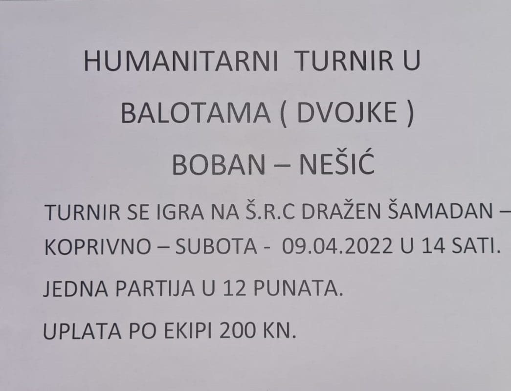 Humanitarni turnir u balotama (dvojke) koji se trebao održati 2. travnja u mjestu Koprivno, odgođen je, zbog vremenskih neprilika, za 9. travnja u 14 sati.