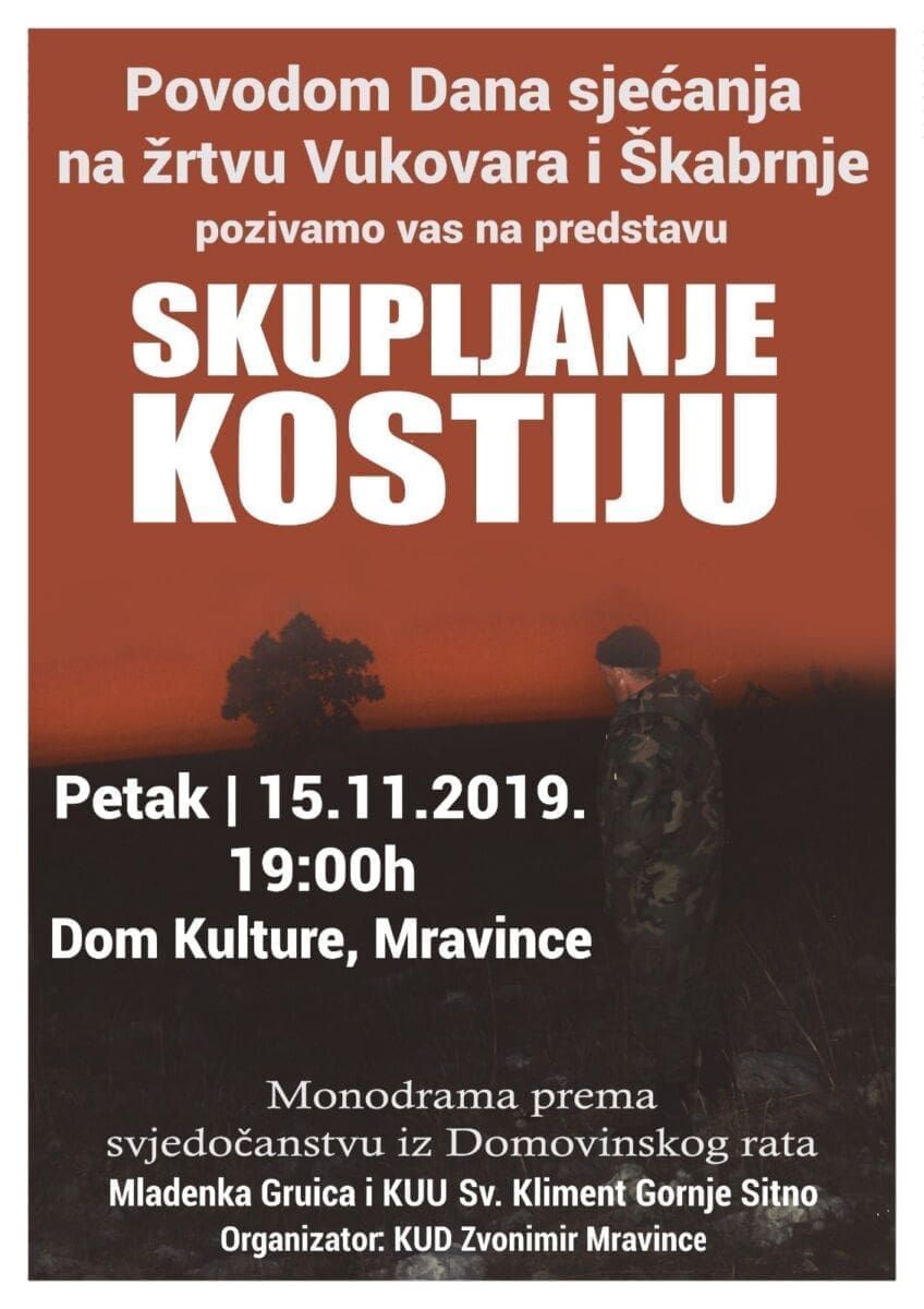 Manifestacija "Tjedan sjećanja na Vukovar i Škabrnju" koju organizira Hrvatska udruga Benedikt, otvara se u ponedjeljak, u 18.30 sati, u Zlatnim vratima, a večer se nastavlja monodramom po istinitom događaju iz Domovinskog rata 'Skupljanje kostiju' u 20 sati.