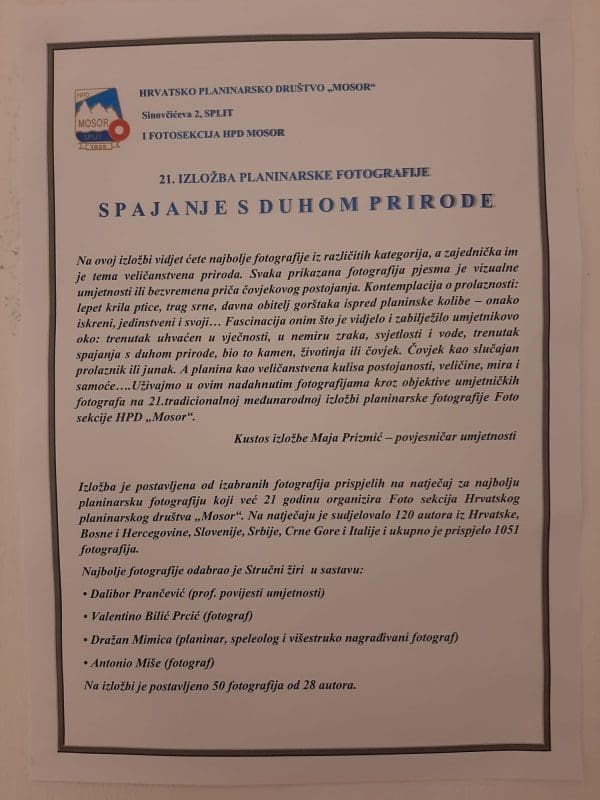 „Na ovoj izložbi vidjet ćete najbolje fotografije iz različitih kategorija, a zajednička im je tema veličanstvena priroda. Svaka prikazana fotografija pjesma je vizualne umjetnosti ili bezvremena priča čovjekovog postojanja. Kontemplacija o prolaznosti: lepet krila ptice, trag srne, davna obitelj gorštaka ispred planinske kolibe – onako iskreni, jedinstveni i svoji… Fascinacija onim što je vidjelo i zabilježilo umjetnikovo oko: trenutak uhvaćen u vječnosti, u nemiru zraka, svjetlosti i vode, trenutak spajanja s duhom prirode, bio to kamen, životinja ili čovjek. Čovjek kao slučajan prolaznik ili junak. A planina kao veličanstvena kulisa postojanosti, veličine, mira i samoće… Uživajmo u ovim nadahnutim fotografijama kroz objektive umjetničkih fotografa na 21. tradicionalnoj međunarodnoj izložbi planinarske fotografije Foto sekcije HPD 'Mosor'."
