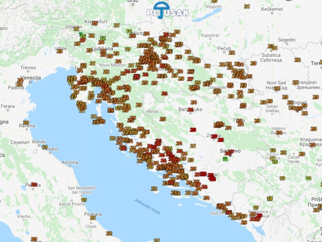 Površinske temperature mora na našem dijelu Jadrana su većinom od 15 do 17 stupnjeva. Prema podacima DHMZ-a, temperatura mora u Malom jezeru na Mljetu, zbog njegove plitkosti, dosegnula je 20 stupnjeva.