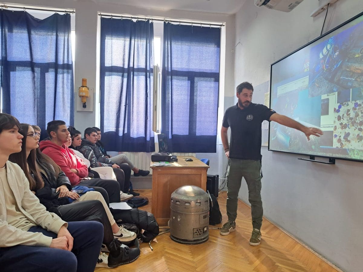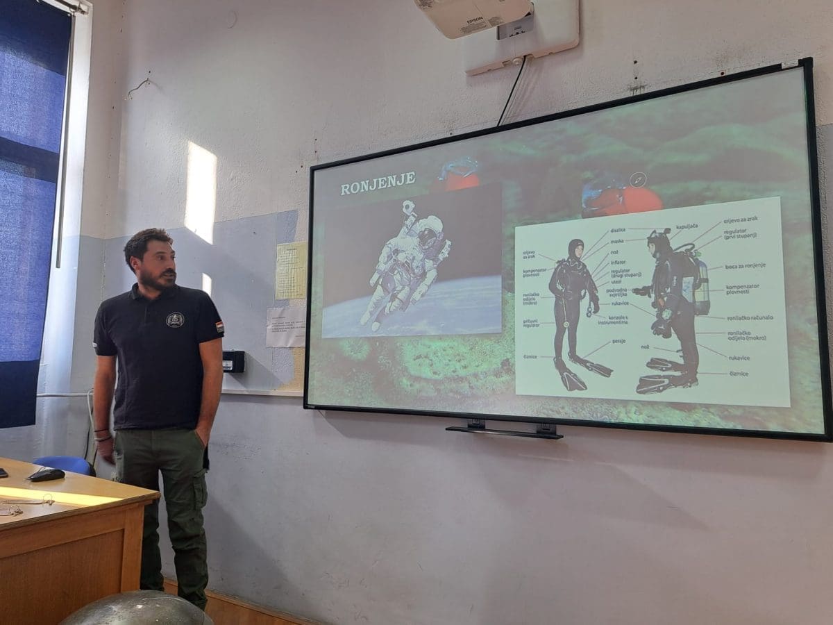 Uz ekološke teme i naglasak na zabludama o ronjenju, učenici su dobili važne informacije o tome kako pristupiti ronilačkim aktivnostima, ali i koje se ljepote i opasnosti kriju ispod morske površine. Kao budući pomorci i čuvari maritimne baštine, tijekom prezentacije su „zaronili“ u arheološka nalazišta i to u ostatke rimskoga i srednjovjekovnoga brodoloma. S obzirom da gospodin Lete sudjeluje u brojnim prijavama i istraživanjima podvodnih arheoloških lokaliteta i ima obrt za podvodne radove (podvodni radovi za luke, lučice i lukobrane), kroz ovo su gostovanje učenici imali priliku iz prve ruke upoznati se s vrijednim arheološkim pronalascima, ali i brojnim zanimljivostima vezanima uz podvodna otkrića na nekoliko lokaliteta u Jadranskome moru. 3D simulacijom spoznali su važnost i obujam podvodnih radova na izgradnji lukobrana, a svestranost gosta otvorila im je i novi, malakološki svijet stražnjoškržnjaka. Učenici su s velikim zanimanjem pratili i naputke o postupanjima u slučaju pronalaska eksplozivnih naprava u moru kojih, na žalost, još uvijek ima mnogo i koji se i dalje pronalaze, ne samo u dubinama, već i u plićemu moru.
