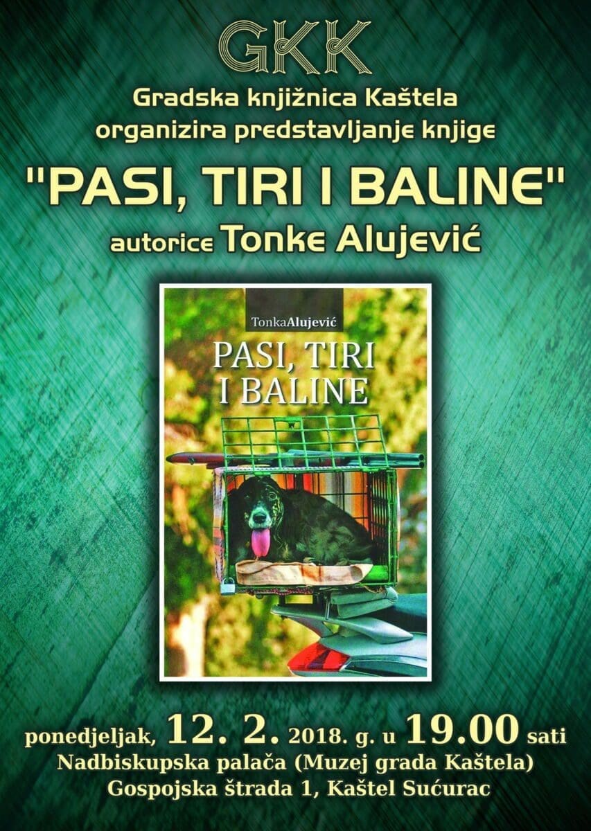 Predstavljanje knjige „Pasi, tiri i baline“ autorice Tonke Alujević održat će se u ponedjeljak 12. veljače u 19 sati u Nadbiskupskoj palači u Kaštel Sućurcu (Muzej grada Kaštela) na adresi Gospojska štrada 1, u organizaciji Gradske knjižnice Kaštela.