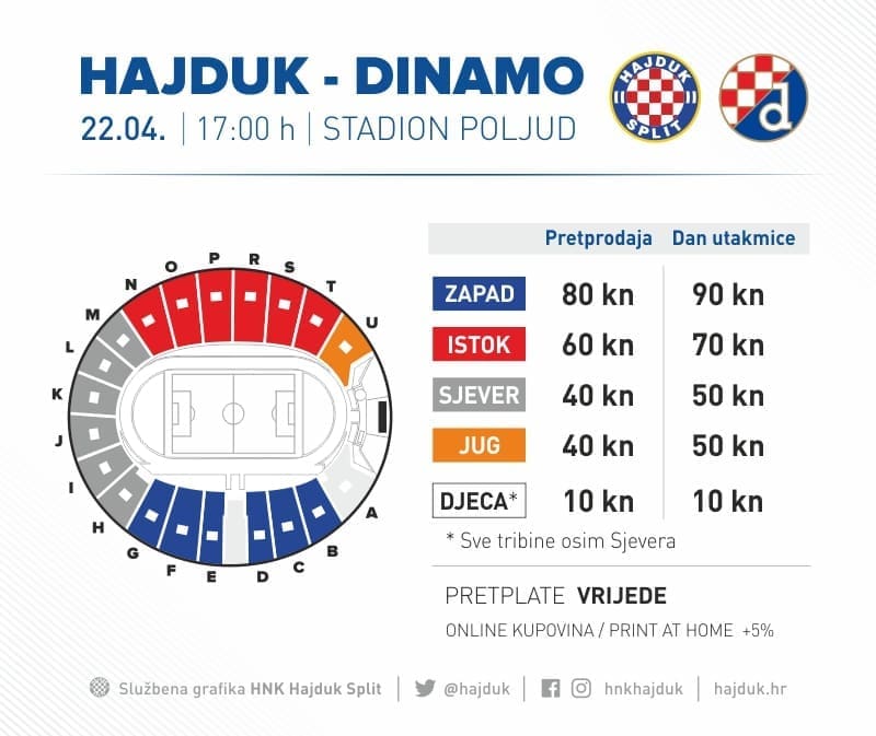 U tijeku je prodaja ulaznica za derbi između Hajduka i Dinama koji će se u nedjelju 22. travnja u 17:00 sati igrati na Poljudu u sklopu 31. kola HT Prve lige.