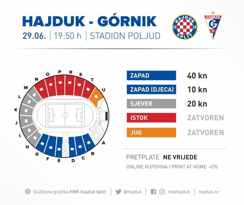 Otvorene će biti sjeverna i zapadna tribina poljudskog stadiona. Istok i ulaz U neće biti u funkciji zbog radova u sklopu Ultra Europe Music Festivala. Pretplate za ovu utakmicu NE VRIJEDE.
