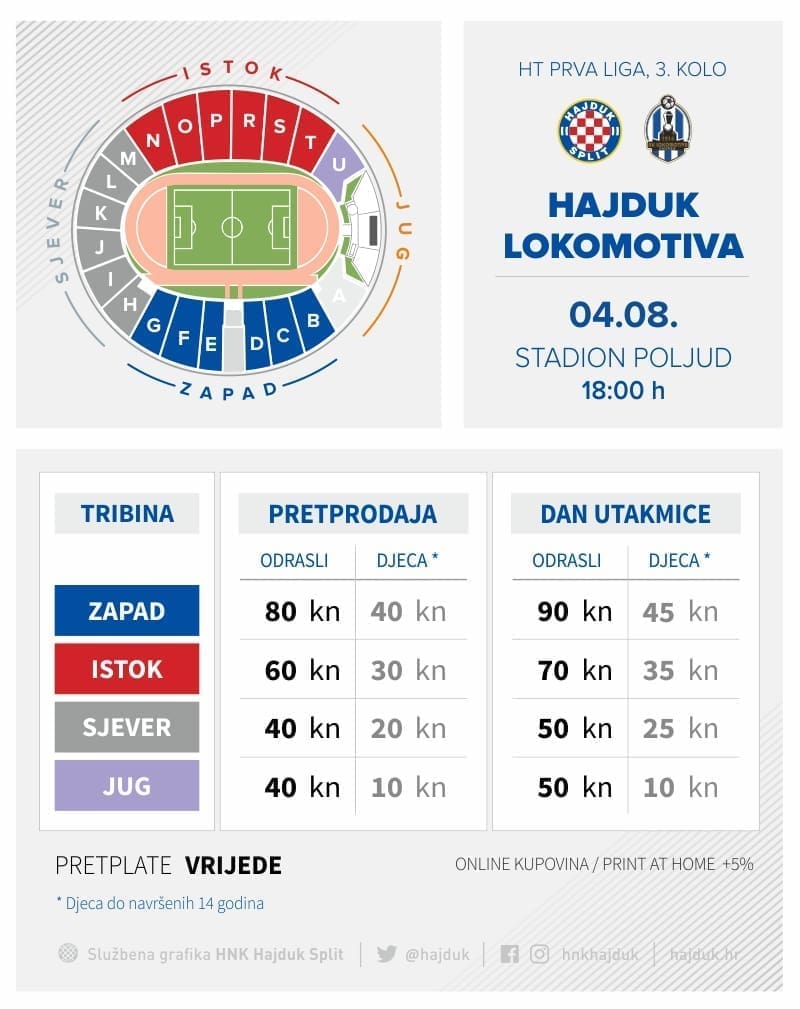 - Cijena dječje ulaznice za tribine Sjever, Istok, Zapad iznosi 50% redovne cijene ulaznice za odrasle, dok za Obiteljsku tribinu vrijedi fiksna cijena u iznosu od 10 kuna (vrijedi za djecu do navršenih 14 godina).