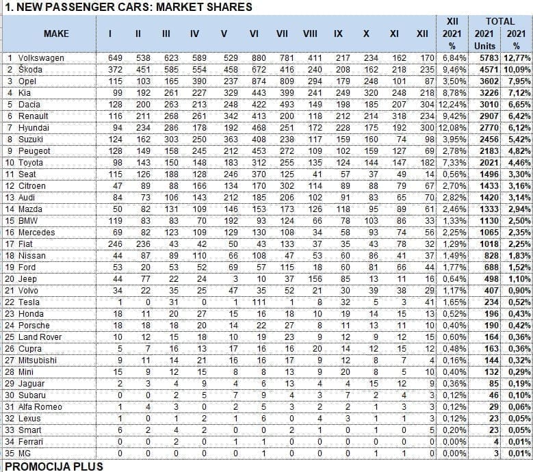 Među markama, tradicionalni tržišni lideri, Volkswagen i Škoda, zadržali su vodeće pozicije. Volkswagen je s 5783 registrirana nova automobila osvojio 12,77 posto tržišta, druga je Škoda s 4571 – 10,09 posto. Treći je Opel, 3602 – 7,95 posto, četvrta Kia 3226 – 7,12 posto, peta Dacia 3010 – 6,65 posto. Slijede Renault, Hyundai, Suzuki, Peugeot, Toyota, javlja Autoportal.