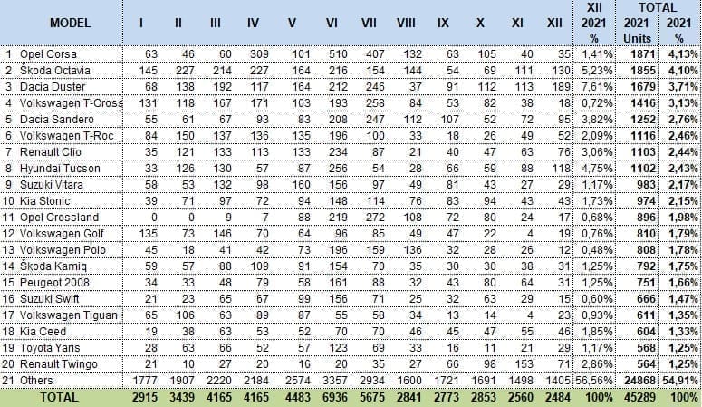 Najprodavaniji modeli su Opel Corsa 1871, Škoda Octavia 1855, Dacia Duster 1679, Volkswagen T-Cross 1416, Dacia Sandero 1252…