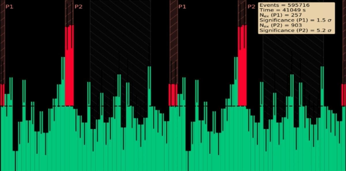 Slika 2. je izmjereni fazogram, koji prikazuje broj detektiranih gama-zrake kao funkciju faze rotacije pulsara (tijekom jedne rotacije snop gama zraka iz pulsara dva puta prođe preko Zemlje). U faznim područjima označenim P1 i P2, očekuje se detektirati više gama zraka jer u tim vremenskim intervalima, pulsar iz maglice Rakovica emitira gama zrake prema Zemlji (označena crvenom bojom na Slici 2.) Emisija detektirana izvan faznih područja P1 i P2 (označena zelenom bojom na Slici 2.) mješavina je različitih popratnih doprinosa, uključujući stabilnu emisiju iz okoline samog pulsara - maglice Rakovice.
