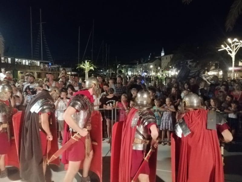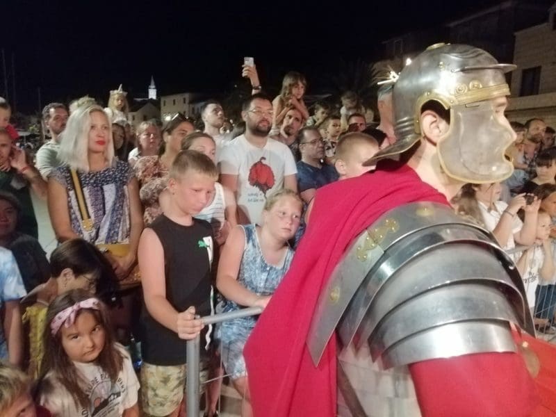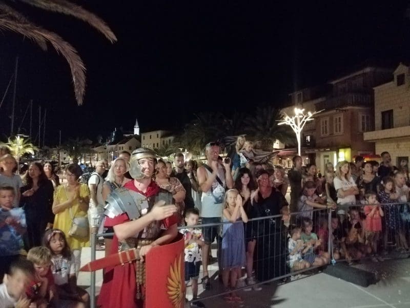 Među brojnom publikom sinoć se našla i glazbena diva Doris Dragović sa suprugom Mariom Budimirom, a šaroliki program uz predstavu je publici donio i izvođenje formacija rimskih legionara, gladijatorske borbe te plesne i akrobatske nastupe u rustikalnim kostimima te je tako punoj Rivi pripremio večer za pamćenje.
