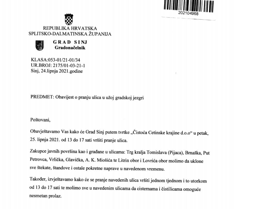 Danas je u Uredu gradonačelnika Grada Sinja održan je sastanak na temu čišćenje ulica u užoj jezgri Grada Sinja. Gradonačelnik Miro Bulj istaknuo je kako se ulice u užoj gradskoj jezgri nedovoljno održavaju te kako je nužno uvesti redovito pranje i održavanje.