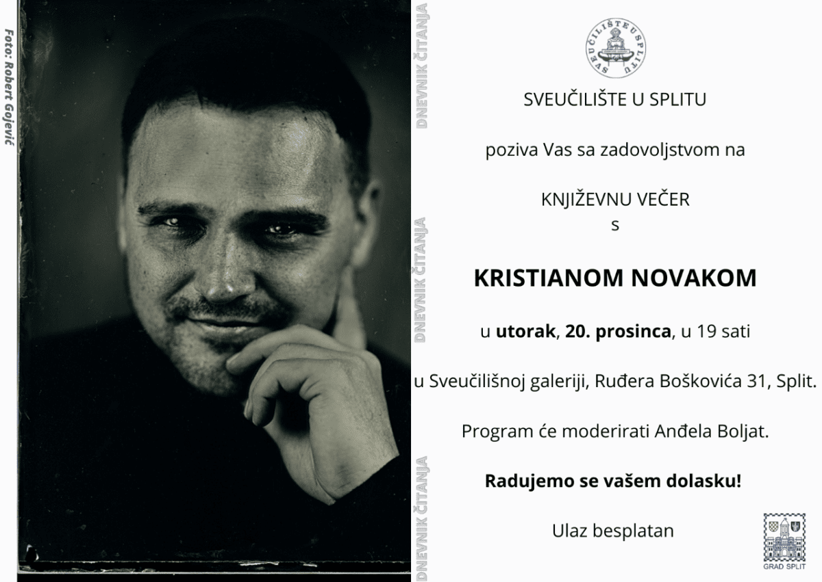 Uoči Božića u sklopu projekta 'Dnevnik čitanja', Splićani i gosti imaj priliku družiti se s jednim od najčitanijih domaćih autora - Kristianom Novakom. Književna večer s Novakom održat će se 20. prosinca u 19 sati u Sveučilišnoj galeriji.