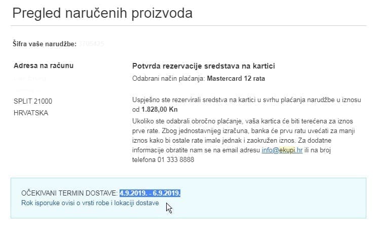 Narudžbu svakodnevno kontroliramo te ćemo istu po potvrdi podnijeti na dvije isporuke bez dodatne naplate dostave, a po informacijama koje imamo kompletnu narudžbu možete očekivati na svojoj adresi najkasnije do 12.9.2019." - stoji u odgovoru eKupi koji su poslali na brojne adrese u Hrvatskoj.