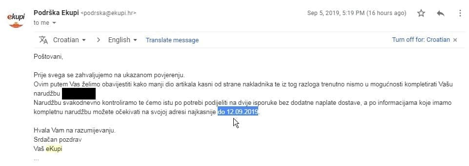 Narudžbu svakodnevno kontroliramo te ćemo istu po potvrdi podnijeti na dvije isporuke bez dodatne naplate dostave, a po informacijama koje imamo kompletnu narudžbu možete očekivati na svojoj adresi najkasnije do 12.9.2019." - stoji u odgovoru eKupi koji su poslali na brojne adrese u Hrvatskoj.