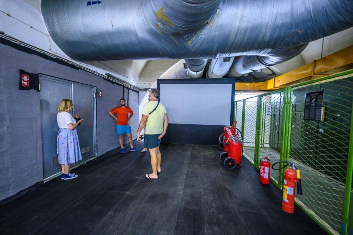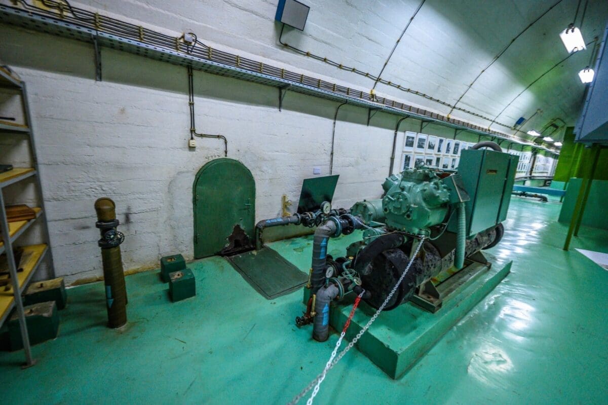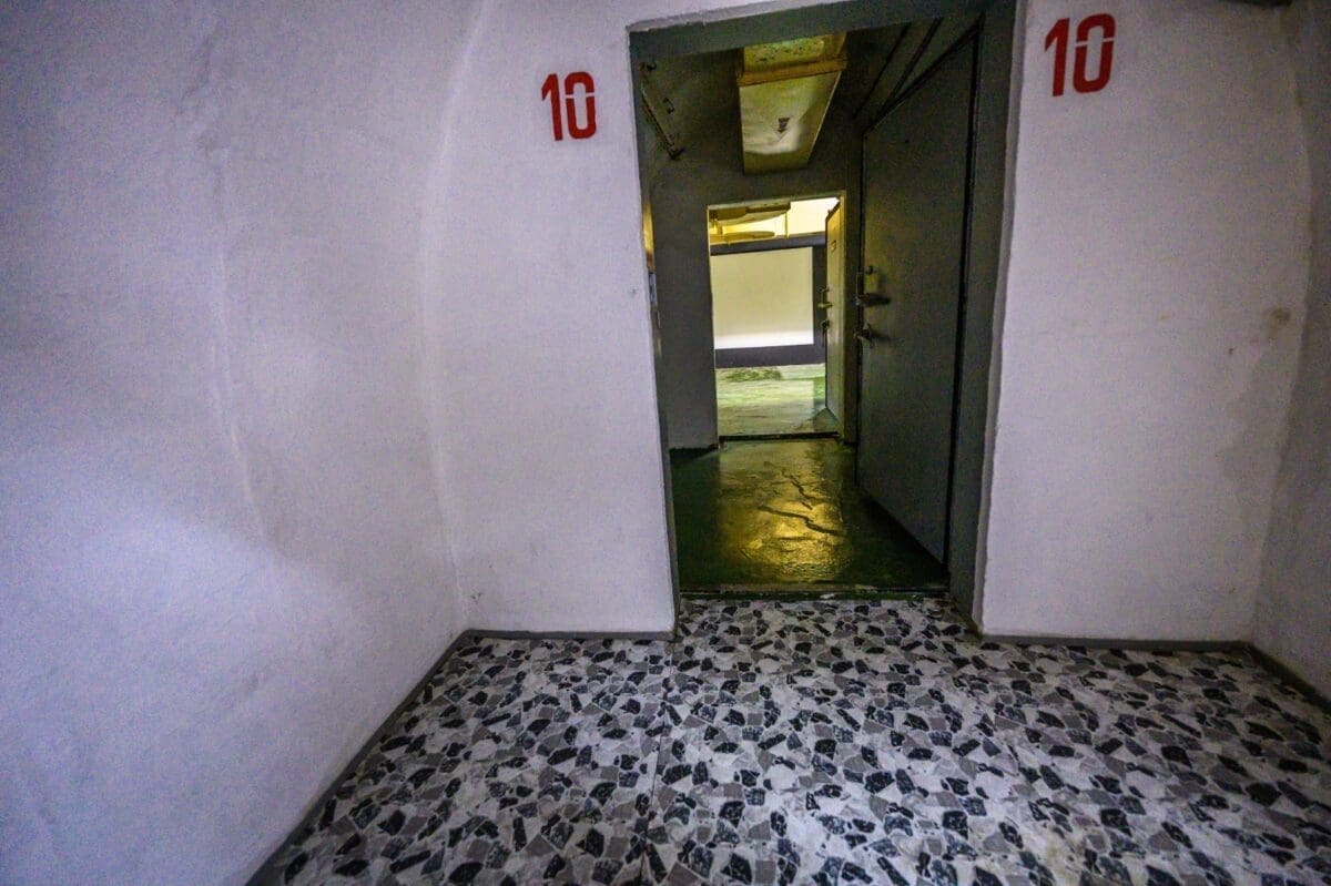 Mi smo sada ispred bloka za klimatizaciju. Dvije cijevi izlaze iz bloka: jedna služi za imputiranje svježeg zraka, a druga vraća zrak van. U slučaju nuklearnog udara bunker bio zagrađen. Unutar bunkera su imali solarne i aerosolne filtere kako bi tih 350 osoba moglo koristiti isti zrak iznova i iznova nekih šest mjeseci, koliko bi ovdje mogli boraviti. Upravo zahvaljujući ovome bloku, stalna temperatura bunkera je oko 20 do 23°C. Zrak je trenutno spojen direktno s vrhom brda, no u slučaju nuklearnog udara to bi bilo hermetički zatvoreno i cirkuliralo.