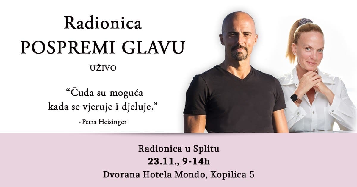 Zato nije loše doći u Split 23.11. (subota) na radionicu Pospremi glavu, Zagrepčanke Petre Heisinger, autorice knjige "Ja sam Petra, nećete me slomiti", autobiografskog djela ove svestrane žene, samohrane majke, nutricionistice, fitness trenerice, glazbenice i književnice.