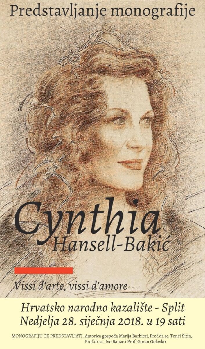 Na velikoj pozornici Hrvatskog narodnog kazališta Split u nedjelju 28. siječnja s početkom u 19 sati bit će predstavljena monografija Cynthia Hansell Bakić – Vissi d'arte, vissi d'amore Marije Barbieri. Oproštaj je to od scene Cynthija Hansell Bakić, proslavljene operne prvakinje američkog porijekla, umjetnice koja je desetljećima pjevala najvažnije operne uloge upravo na sceni splitskog teatra, te svojevrsni hommage umjetnosti koju je dala Hrvatskoj, pisani spomenik kako umjetnosti kazališta tako i umjetničkoj povijesti Splita. O Cynthiji Hansell Bakić na prezentaciji će, pored autorice monografije, glazbene publicistkinje i operne kritičarke Marije Barbieri, govoriti prof. dr. sc. Ivo Banac, prof. dr. sc. Tonći Šitin i prof. Goran Golovko, intendant HNK Split, a nastupit će Cynthijine dugogodišnje kolege Vinko Maroević, Ivica Čikeš, Zbor Opere HNK Split, te njeni učenici, današnji solisti splitskog teatra Antonija Teskera i Mate Akrap.
