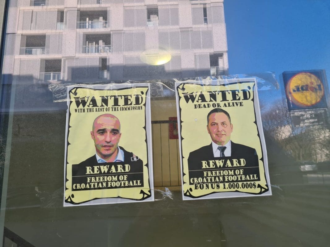 Na plakatima na engleskom jeziku piše "Traže se živi ili mrtvi", a ispod toga toga piše "Nagrada milijun dolara i Sloboda hrvatskom nogometu".