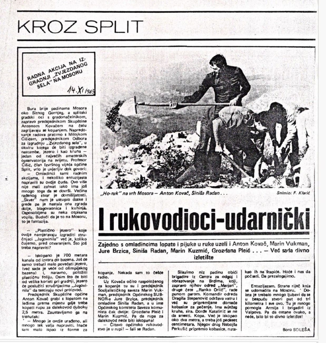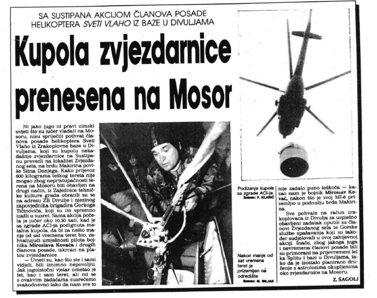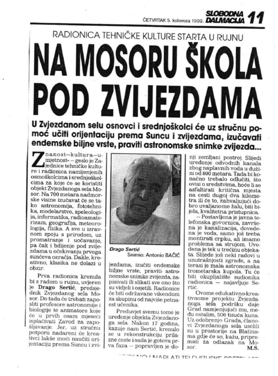 „Ideja o Zvjezdanom selu Mosor došla je ’74. godine. Postojalo je Društvo astronoma amatera Split čiji sam i ja bio jedan od osnivača. Tu je bio moj sin. On je osnovao to društvo. Nažalost, tako to biva u životu, on pogiba u prometnoj nesreći, a ta ideja o vangradskoj zvjezdarnici je ostala u zalog i onda sam se ja prihvatio toga da sve realiziram. Možete samo zamisliti, napraviti zgradu na obronku planine, bez ceste, bez vode, bez struje. Na promociji kamena temeljca bila je gradonačelnica Gordana Kosanović. Išli smo kozjom stazom do brda Makirina, na 700 metara nadmorske visine, i čujem kao danas kad je rekla: Ovdje ni jedna cigla neće doći, a kamoli zgrada. Tu organizaciju je priredilo to društvo i ondašnja omladinska konferencija. Međutim, ona se prevarila. Bilo je jezivo teško, ali ja nigdje nisam spominjao svoj interni motiv jer bilo bi kontraproduktivno da kažem da to pravim zbog sina. Prvi koji su sudjelovali u izgradnji su bili iz Sivog doma na Brdima. Na tom terenu je bio prirodni izvor vode, a oni su prvi bili. Kasnije su došle omladinske brigade iz gradova prijatelja, to su sve učenici tehničkih škola.