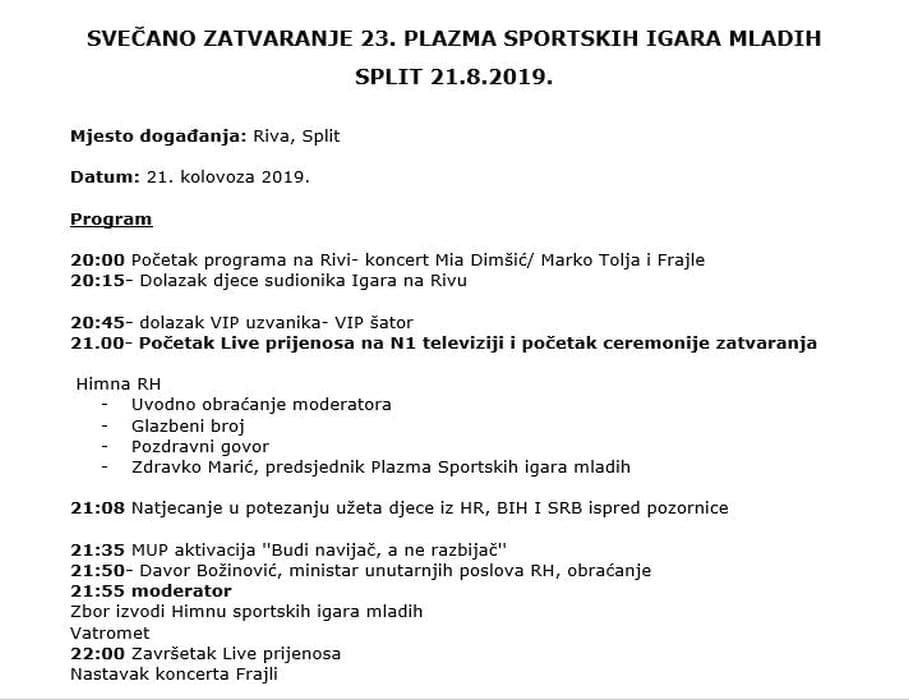 Mnogobrojni sportaši te pripadnici gospodarskog i političkog života regije družit će se s natjecateljima na Rivi. U sklopu ceremonije pripadnici Ministarstva unutarnjih poslova RH predstavit će veliku zajedničku akciju ''Budi navijač, a ne razbijač'', a Igre će službeno zatvoriti Davor Božinović, ministar unutarnjih poslova RH.