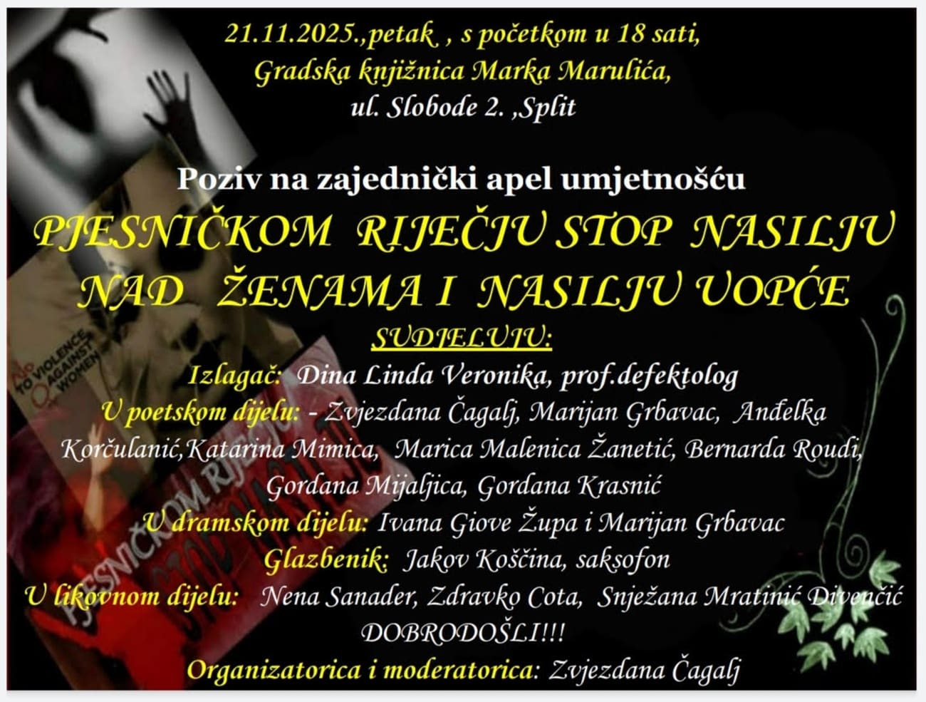 U povodu obilježavanja Dana borbe protiv nasilja nad ženama, u petak, 21. studenoga 2025., u Gradskoj knjižnici Marka Marulića (ul. Slobode 2, Split) održat će se umjetničko-humanitarni program pod nazivom „Pjesničkom riječju – STOP nasilju nad ženama i nasilju uopće”. Program počinje u 18 sati, a okuplja književnike, glazbenike, likovne umjetnike i dramske izvođače koji će zajedničkim stvaralaštvom poslati snažnu poruku protiv svakog oblika nasilja.