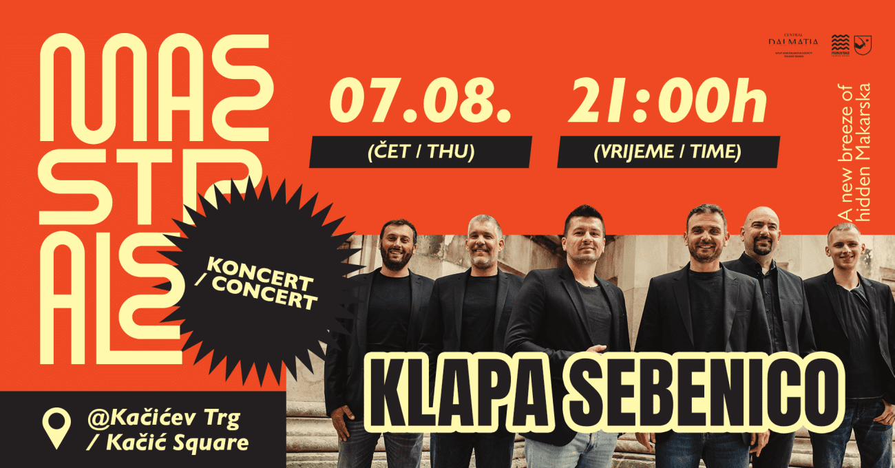 Doživite čaroliju dalmatinske pjesme u srcu Makarske! 07. kolovoza klapa Sebenico donosi večer ispunjenu emocijama, tradicijom i vrhunskom vokalnom izvedbom – od klapskih klasika do popularnih obrada u a cappella ruhu.