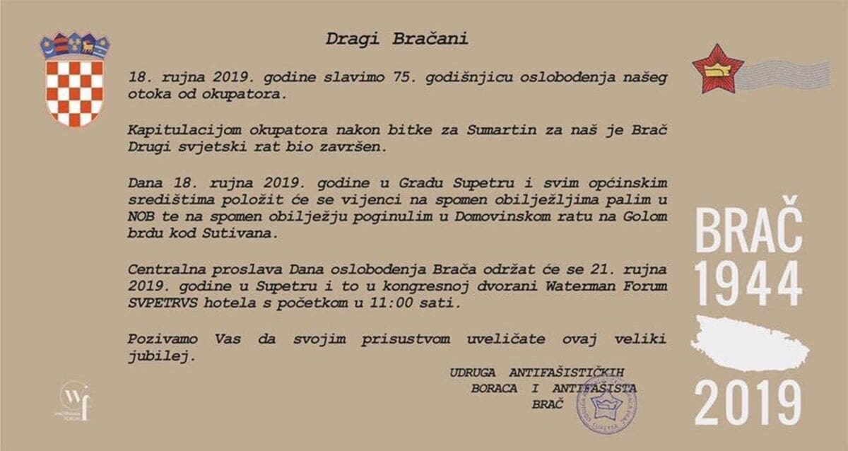 Udruga antifašističkih boraca i antifašista Brač poslala je poruku Bračanima. Najavljuju da se 18. rujna slavi 75. obljetnica oslobođenja otoka Brača od okupatora.