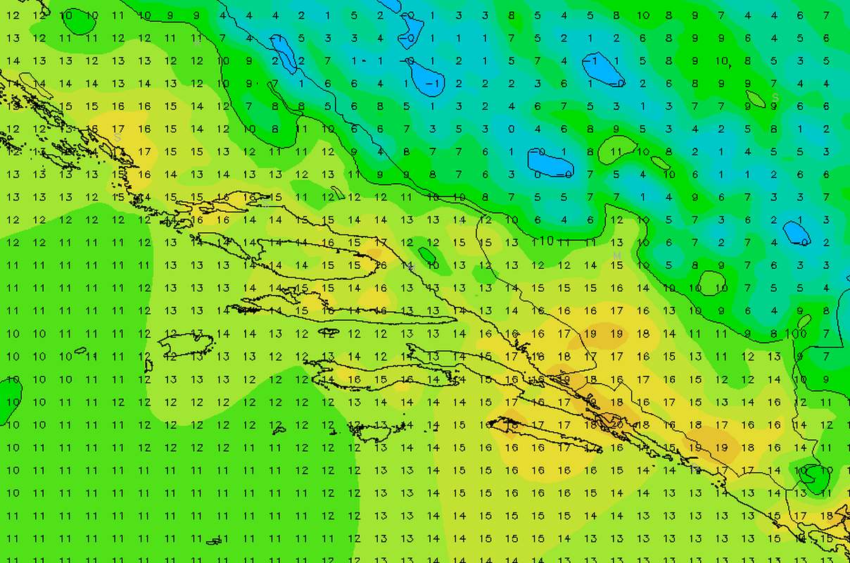 Danas će biti umjereno do znatno oblačno, tek mjestimice uz slabu kišu koja je izglednija na sjeveru Dalmacije. Puhat će umjereno do jako jugo. Navečer će na sjeveru Dalmacije zapuhati umjerena i pojačana bura. Od jutra toplo, najviše dnevne temperature zraka od 13 do 18°C.