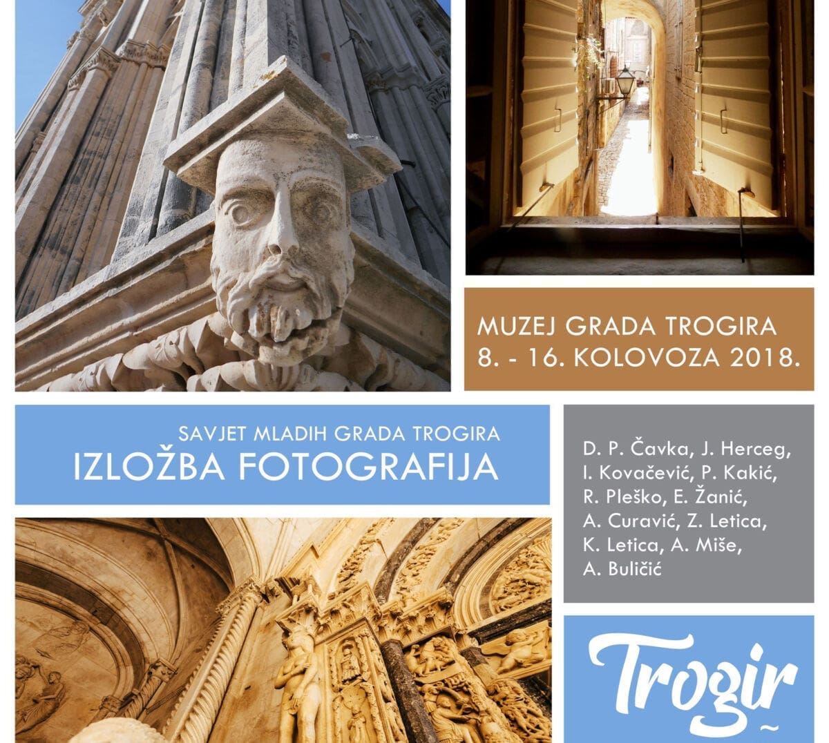 Kamene ljepote Trogira koje su uočili i snimili Dominik Petar Čavka, Joško Herceg, Ivana Kovačević, Petra Kakić, Robert Pleško, Eni Žanić, Ana Curavić, Zlatan Letica, Katica Letica, Antonio Miše i Angela Buličić moći će se razgledati do 16. kolovoza 2018. svakim danom od 10:00 do 13:00 sati te od 18:00 do 21:00 sat.