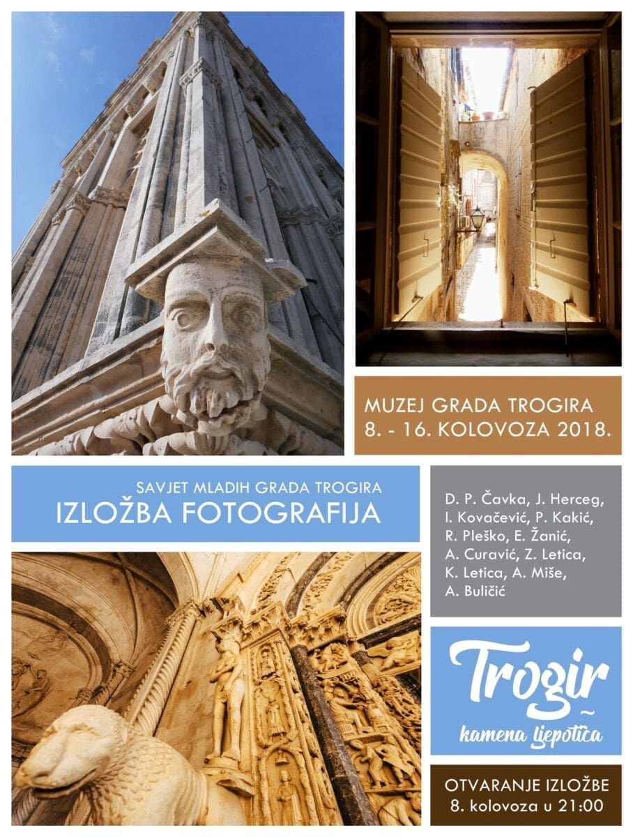 U atriju Muzeja grada Trogira u srijedu, 8. kolovoza 2018. u 21:00 sat otvara se izložba fotografija "Trogir - kamena ljepotica", nastala kao rezultat foto-natječaja održanih 2015., 2016. i 2017. godine u organizaciji Savjeta mladih Grada Trogira.