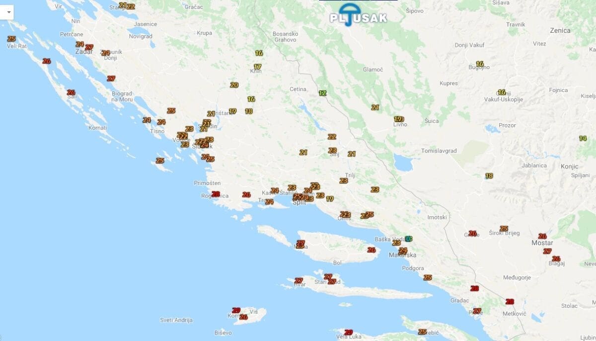Temperature zraka jako variraju, ovisno o dijelu Dalmaciji. Tako je na kninskom području u 12 sati tek 17 stupnjeva, a na Hvaru, Visu i Korčuli pojedine mjerne postaje bilježe 28 ili 29 stupnjeva.