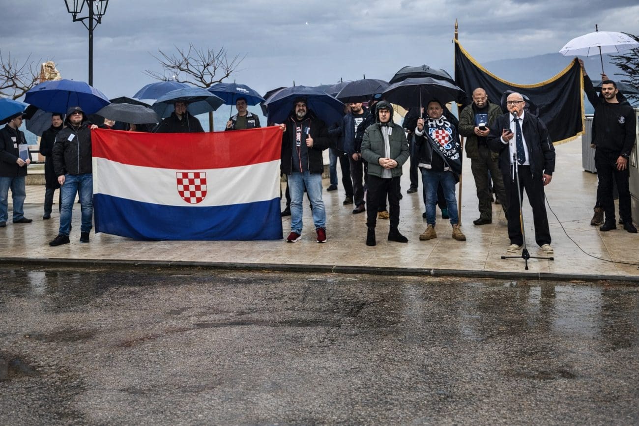 Ispred murala s imenom vukovarskog heroja Jean-Michele Nicoliera u Supetru okupili su se u 11 sati desničari predvođeni Draženom Keleminecom.