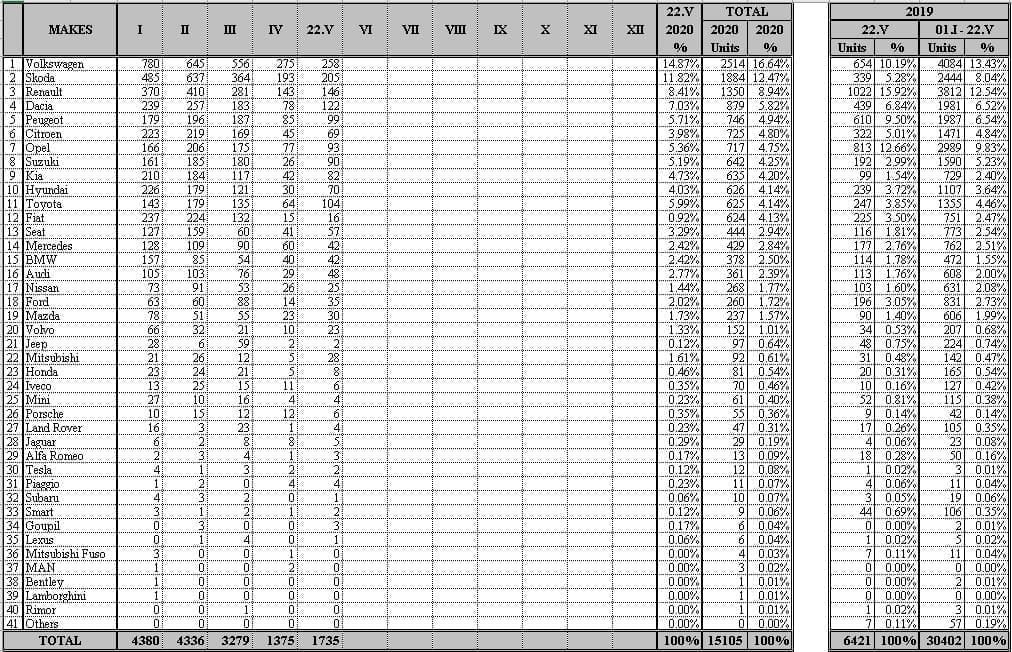 Od 1. siječnja do 22. svibnja 2020. u Hrvatskoj je registriranih 15.105 novih automobila, u usporedbi s 30.402 u istom razdoblju 2019., te je ukupni pad 50,3 posto, zahvaljujući rezultatima iz siječnja i veljače (prije razbuktavanja krize), javlja autoportal.