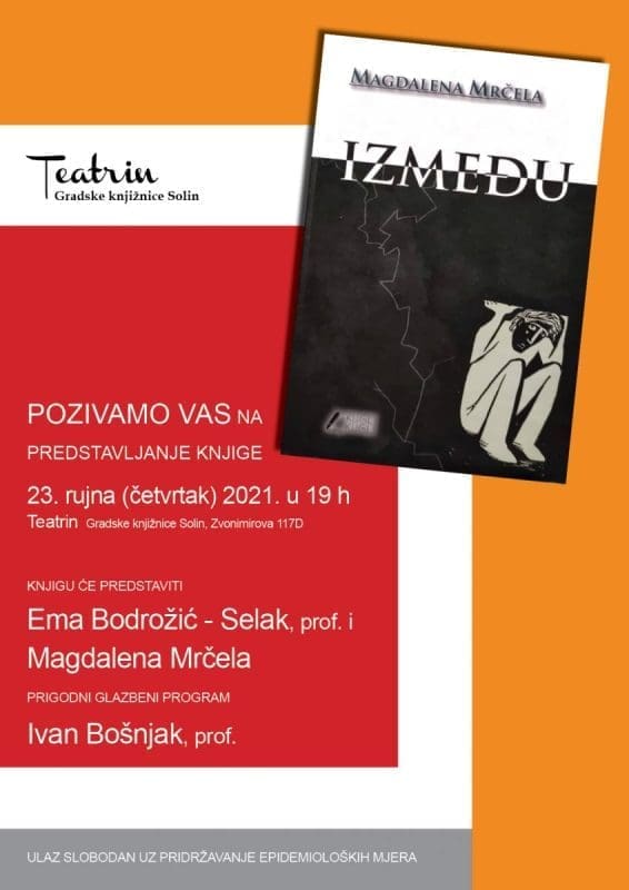 U mjesecu rujnu, točnije, 10. rujna obilježava se Svjetski dan prevencije samoubojstava. Tim povodom u Teatrinu Gradske knjižnice Solin u četvrtak, 23. rujna s početkom u 19 sati održat će se predstavljanje knjige „Između“ autorice Magdalene Mrčele.