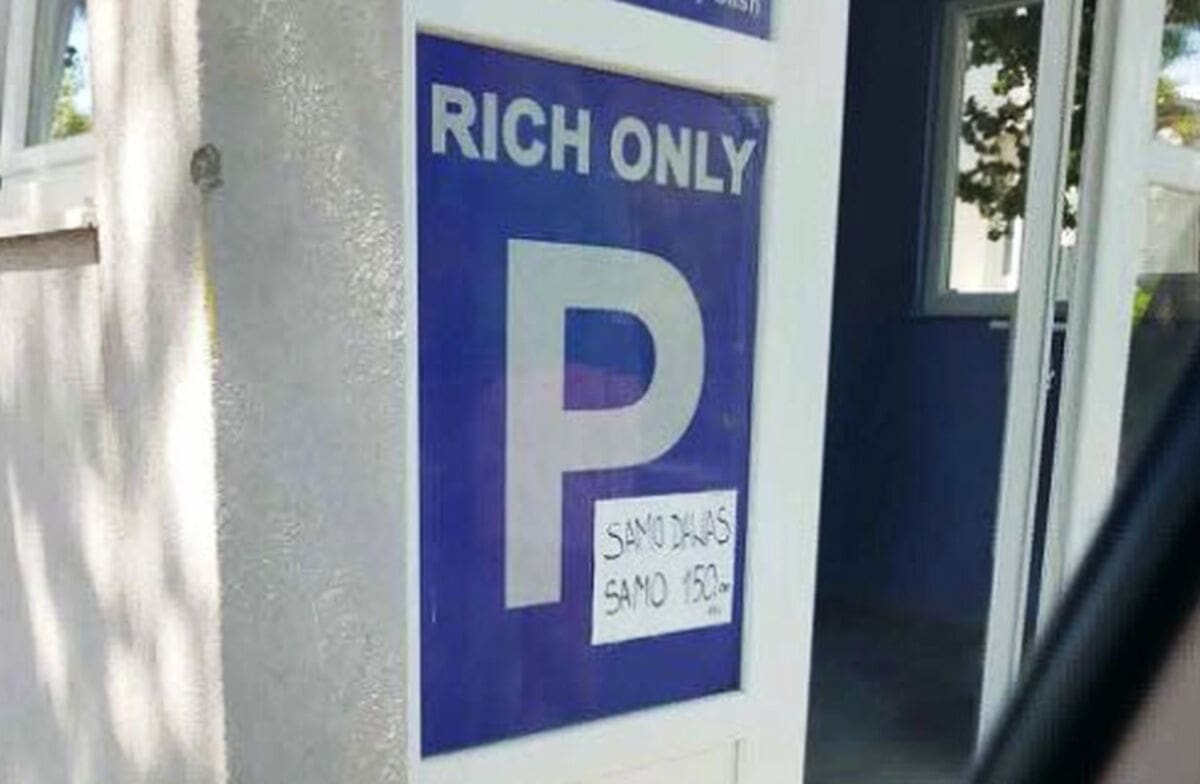 Imati parcelu za parkiranje u nekoj od turističkih destinacija na Jadranu prava je zlatna koka. Zna to i vlasnik privatnog parking u Tučepima koji parkiranje naplaćuje 150 kuna. Na parkirališnu kućicu postavio je natpis "Rich only", što znači "Parking samo za bogate".