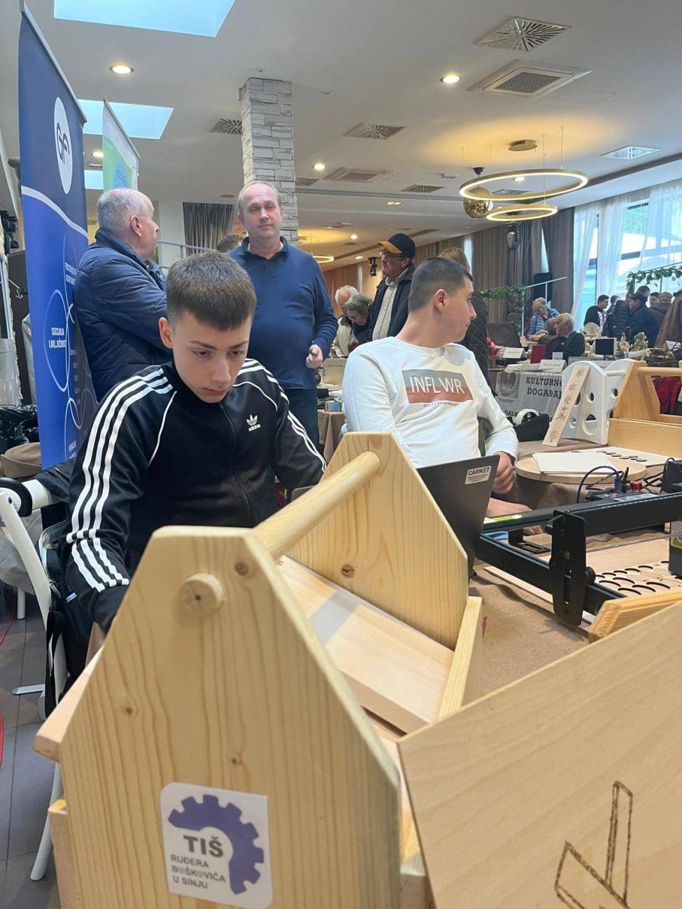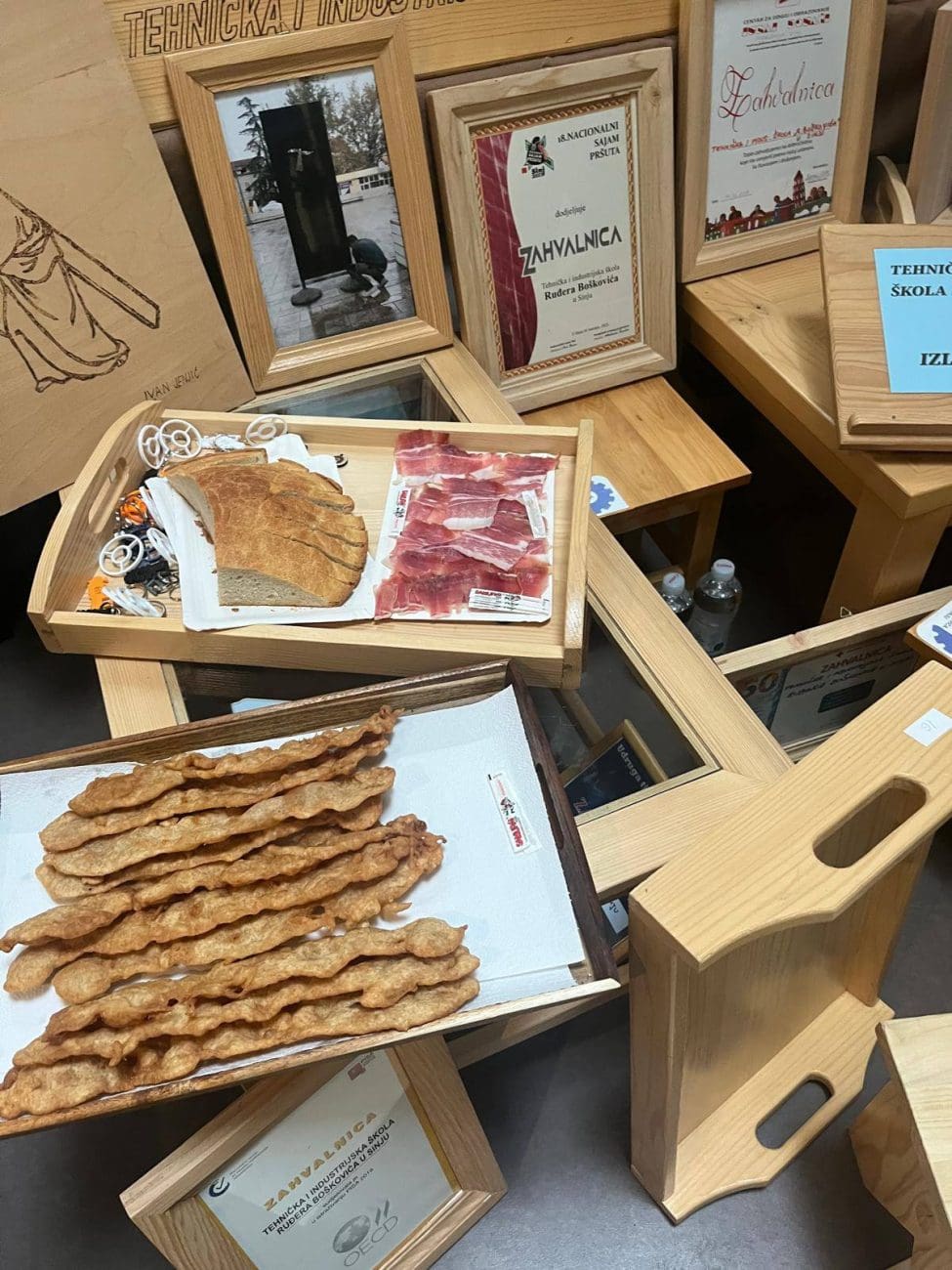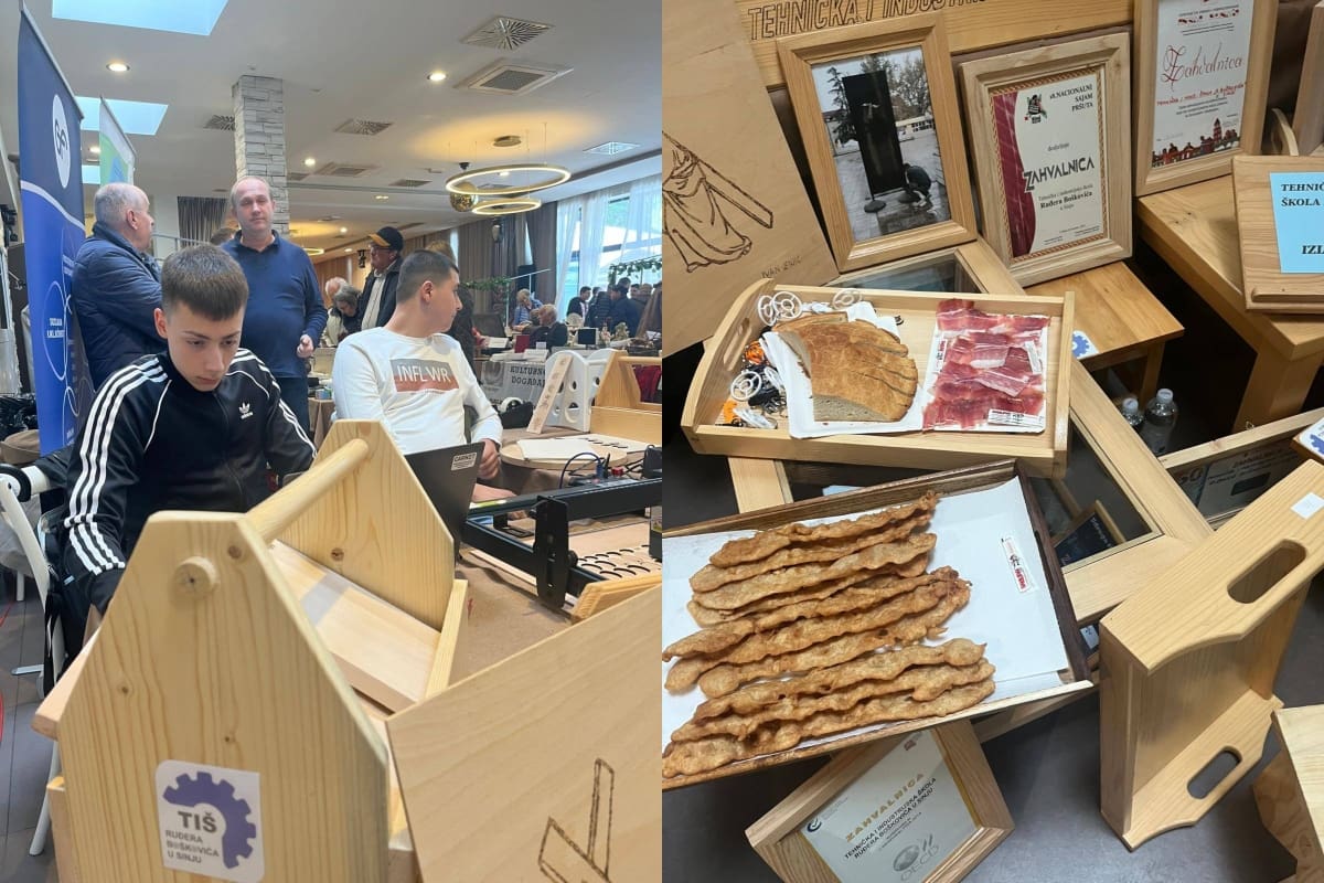 Učenici zanimanja stolar predstavili su svoje rukotvorine i uživo izrađivali personalizirane privjeske koristeći CNC laser za graviranje. Naš štand škole bio je jedno od najposjećenijih mjesta na sajmu, a posebno nas je obradovalo gostovanje u programu Dobro jutro, Hrvatska na HRT-u.