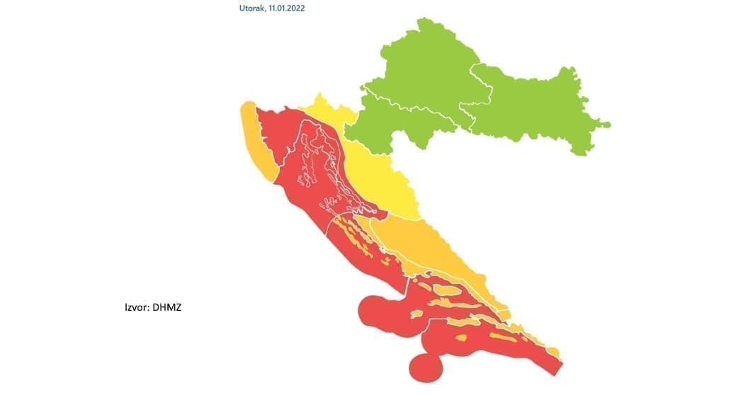 Za danas je izdano crveno upozorenje za Riječku regiju, Kvarner i Kvarnerić, Velebitski kanal i Dalmaciju te narančasto za Splitsku regiju i Zapadnu obalu Istre.