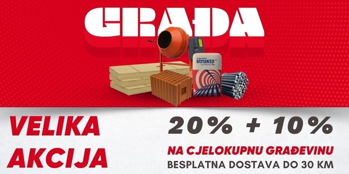 Uzbudljive vijesti iz svijeta građevine stižu iz Građa-prodajnih centara. Nova akcijska ponuda obećava kombinaciju nevjerojatnih cijena i vrhunske kvalitete građevinskih materijala. Na sve iznose veće od 499 € ‘Građa’ nudi mogućnost nevjerojatnih 20 % + 10 % popusta na cijeli asortiman građevinskih materijala.
