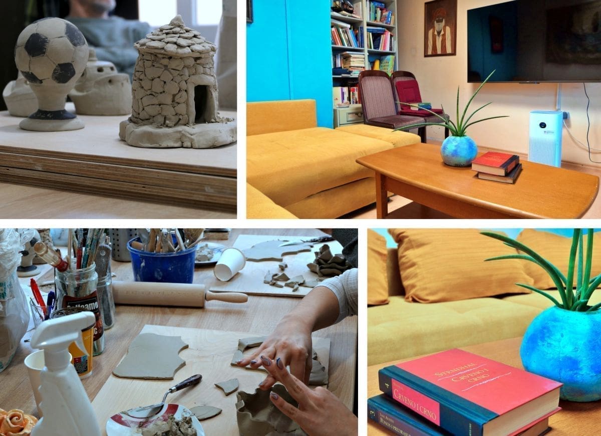 Dnevni centar opremljen je brojnim sadržajima – TV-om, društvenim igrama i mini-knjižnicom – kako bi se korisnicima omogućilo kvalitetno provođenje slobodnog vremena uz zajednička druženja, gledanja utakmica, igranje kvizova, pikada i slično. Aktivnosti u art zoni započele su ovaj petak, a pod vodstvom Petra Bilića, likovnog edukatora i waldorfskog pedagoga, korisnici, volonteri i suradnici udruge zajedno su učili raditi s glinom.