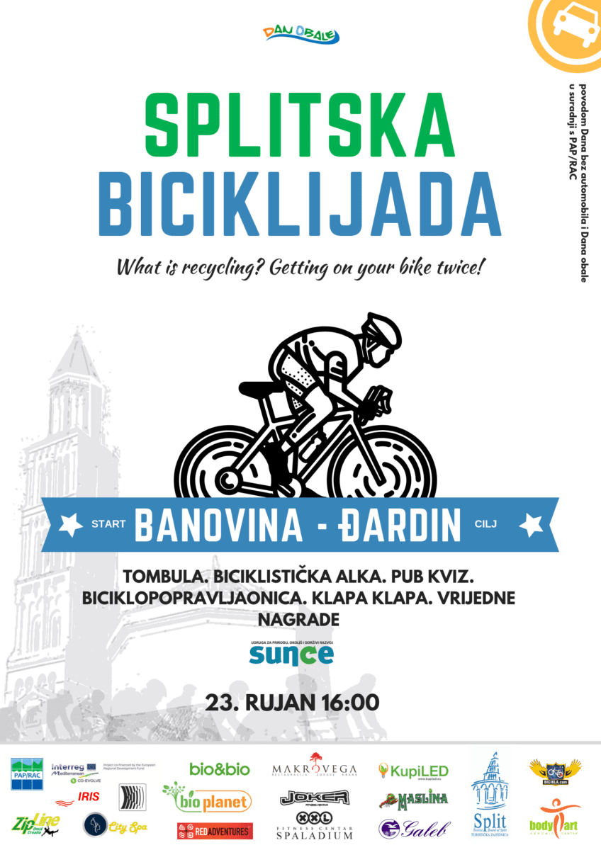 Udruga Sunce Split 23. rujna 2018. po sedmi put organizira Splitsku biciklijadu povodom obilježavanja Europskog dana bez automobila 22. rujna 2018. Ove godine Splitska biciklijada organizira se u suradnji Centrom za regionalne aktivnosti programa prioritetnih akcija (PAP-RAC) kao dio programa obilježavanja Dana obale.