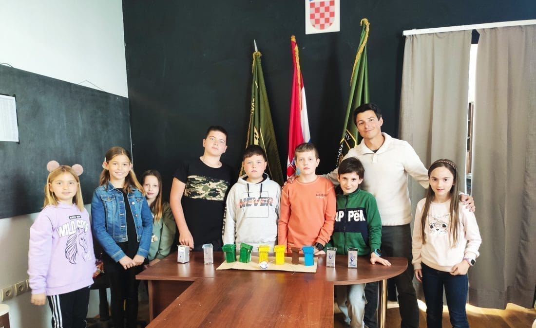 Nakon toga, učenici razredne nastave izrađivali su malene kantice od kartona, štapića za roštilj i ostalih jednostavnih materijala te su kantice obojili plavom, žutom, zelenom i smeđom bojom kako bi simulirale pojedine vrste spremnika za razvrstavanje otpada.