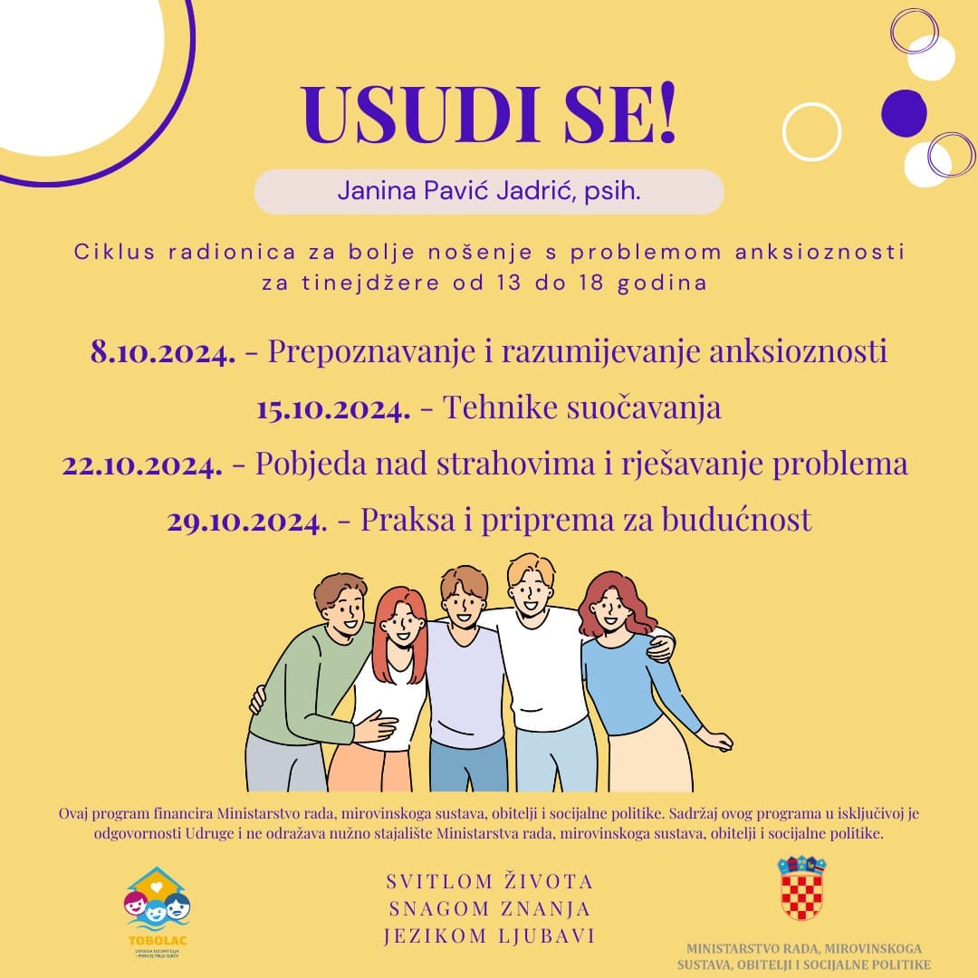 Udruga Tobolac poziva sve tinejdžere koji se suočavaju s problemima anksioznosti da se priključe besplatnom programu stručne pomoći pod nazivom "Usudi se!". Program vodi iskusna psihologinja i kognitivno-bihevioralna terapeutkinja Janina Pavić Jadrić, koja će mladima pružiti potrebne alate i podršku u borbi s anksioznošću.